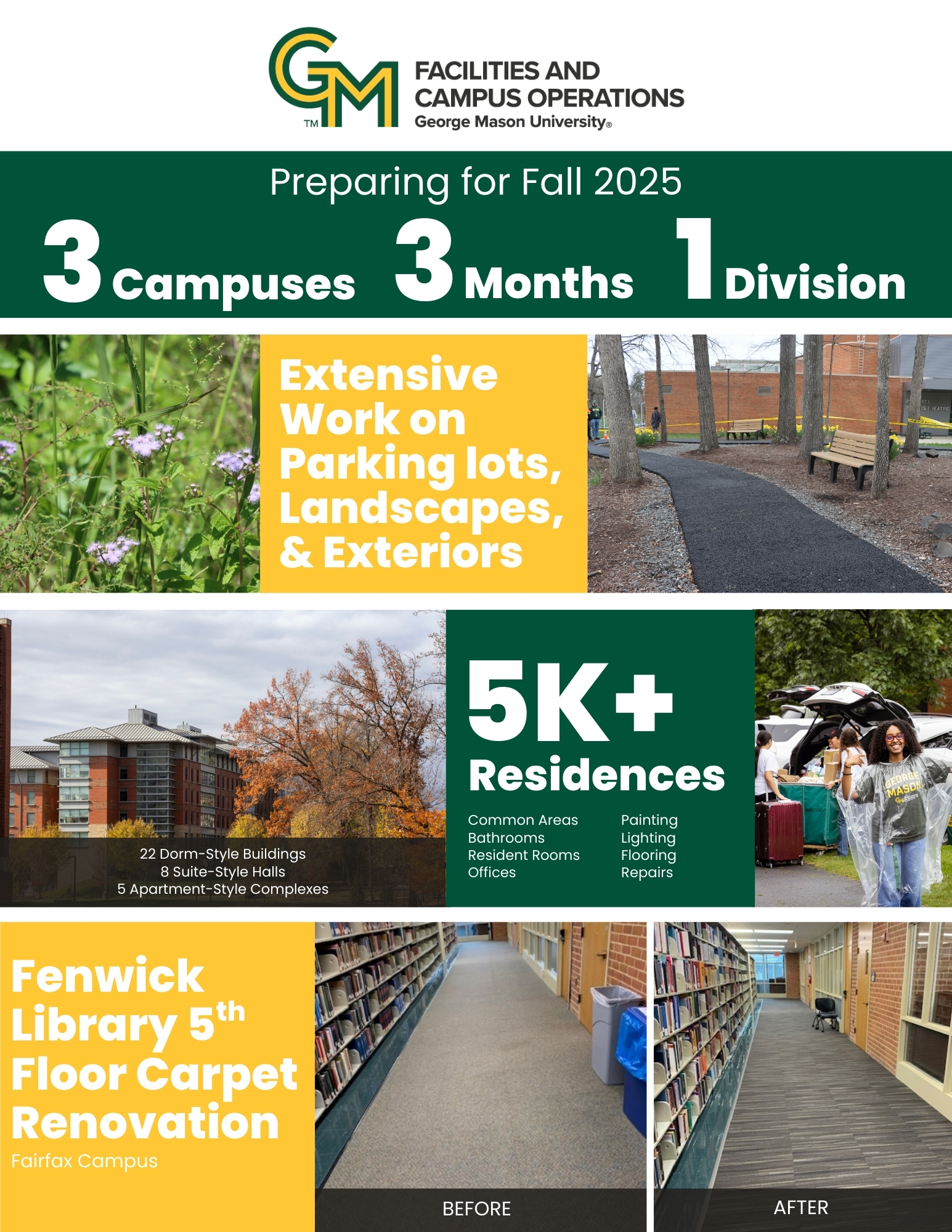 During the summer months, in preparation for the start of the fall semester, George Mason Facilities & Campus Operations (F&CO) runs through an extensive checklist to get all campuses ready. From landscaping upkeep to classroom refreshes to updating signage, F&CO ensures that each experience on campus is one of quality. Below are just some examples of how F&CO handles the operations of making George Mason University run smoothly.